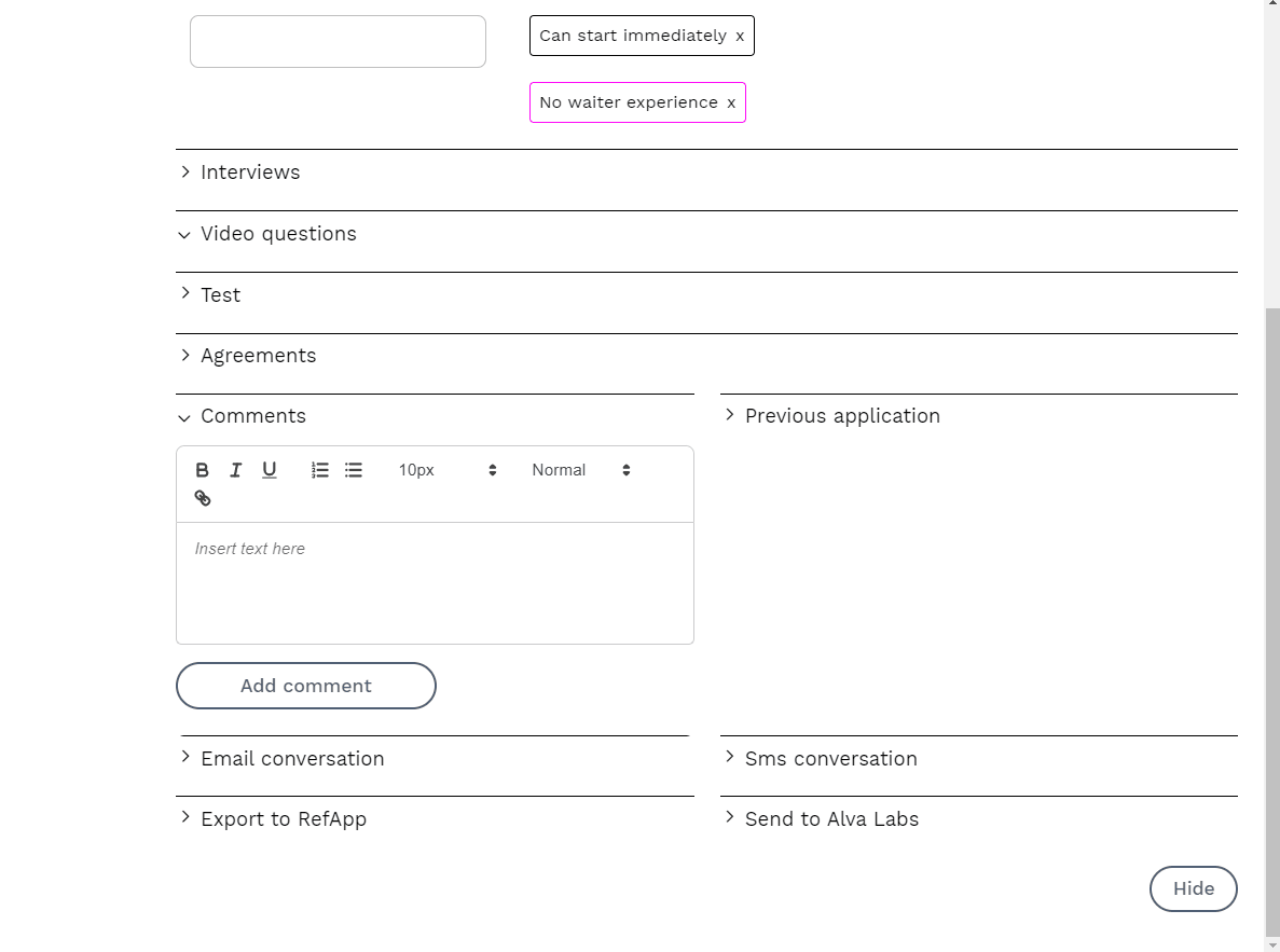 Comments added to the candidate cards are only visible to those with permission to view the job. You can tag your colleagues by writing @name. The tag will appear as a notification on the colleague’s dashboard.