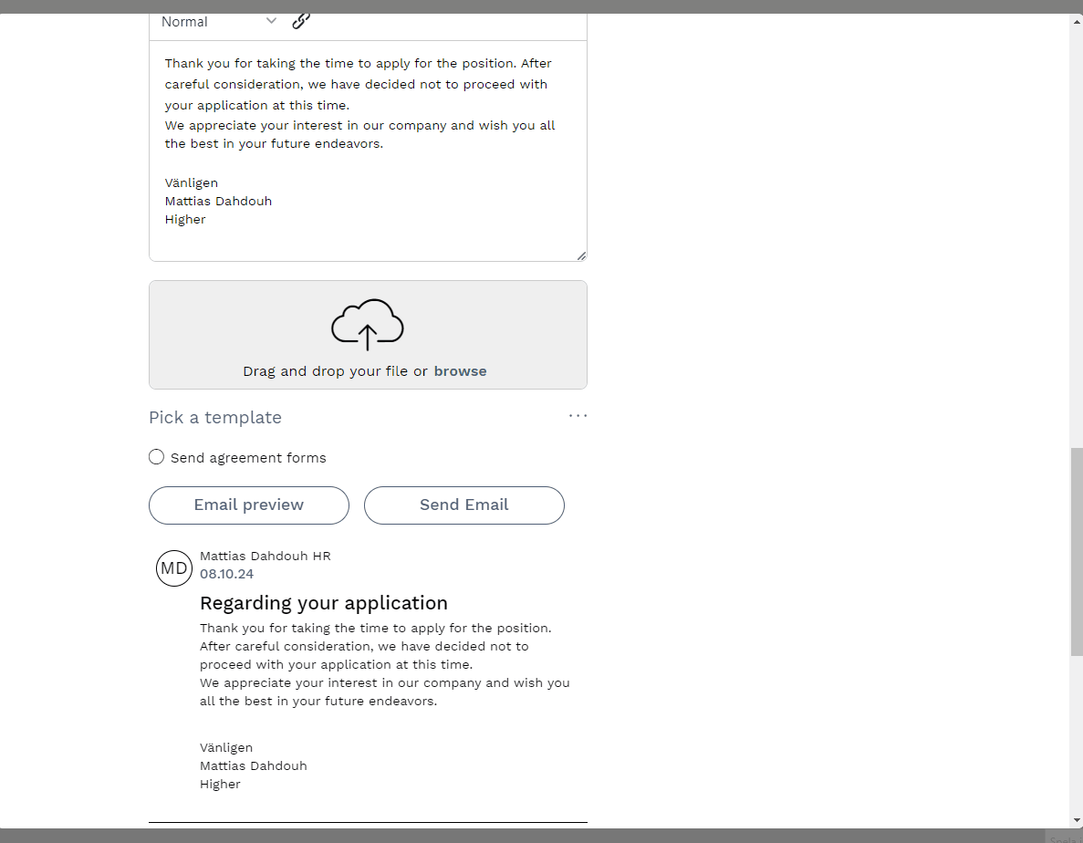 Here you can see the communication between you and the candidate. You can use email templates to streamline your communication, attach files, and write fully customized emails to candidates. Any responses from the recipient are collected in an email thread on the candidate card.