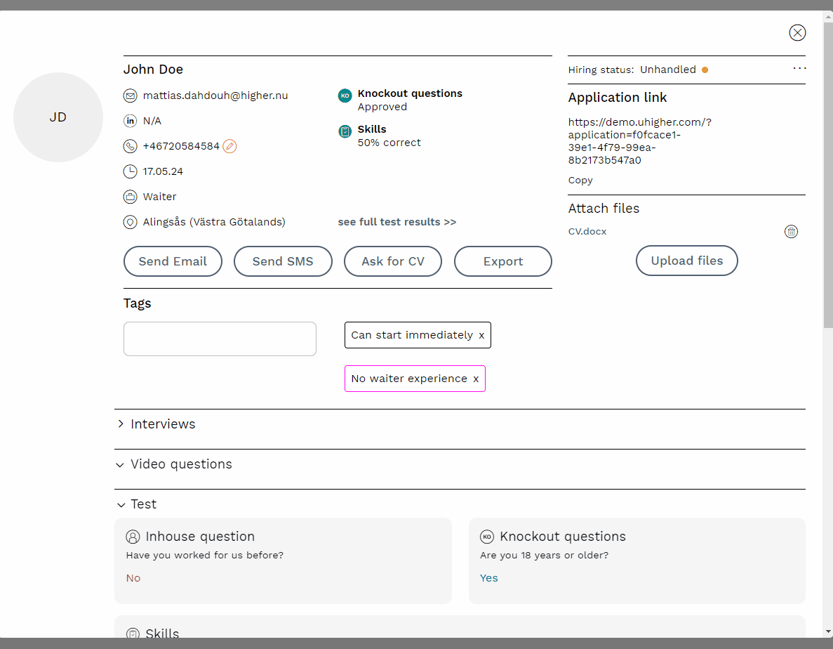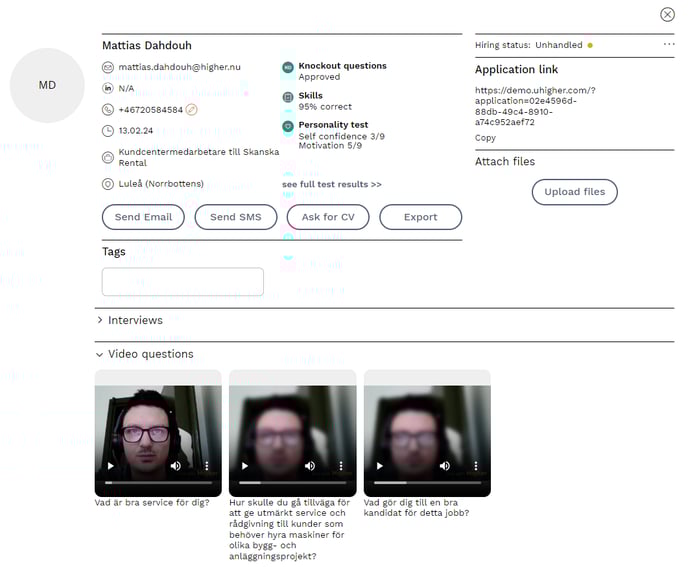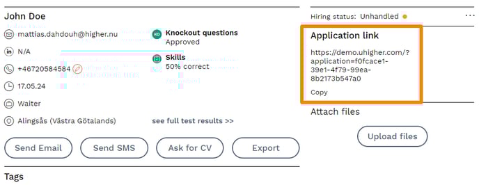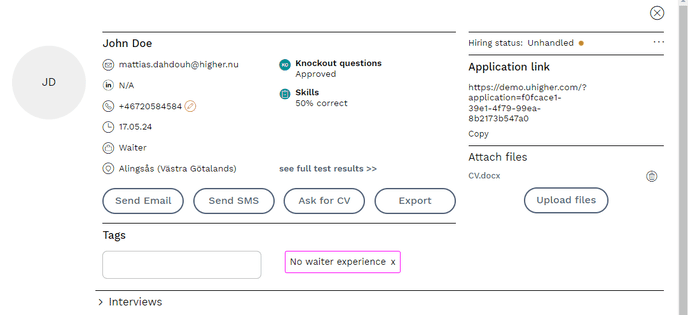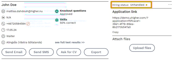 Here you can see when and which job the candidate applied for, as well as their provided contact details.