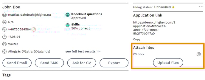 If the candidate has attached files, they will appear in a list on the candidate card. Remove attached files by clicking on the trash icon. You can upload files manually by pressing "upload files."