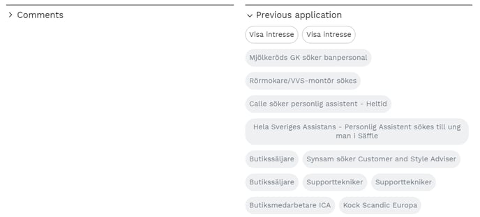 In this tab, you can see if the candidate is part of any ongoing or previous applications you’ve posted. Gray titles indicate that the job has been archived and closed. Other titles are active postings, where the color indicates the hiring status of the candidate.