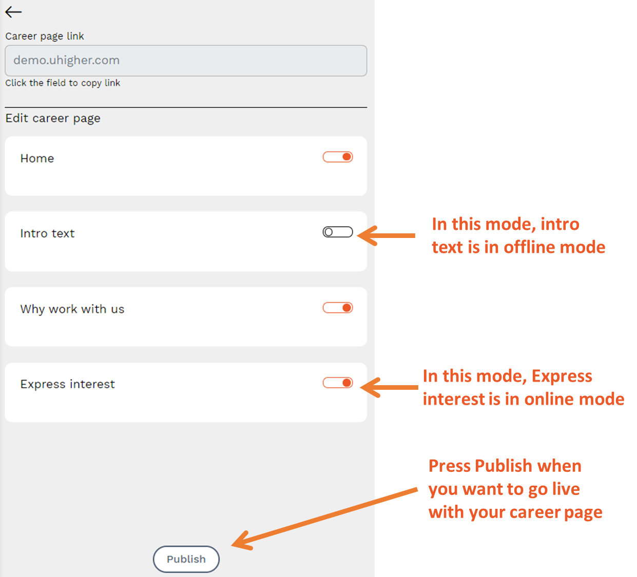 By default, all changes to the career page are made "offline". To decide what should be visible on the career page, activate the orange sliders. Finally, press "Publish" and the page goes live.