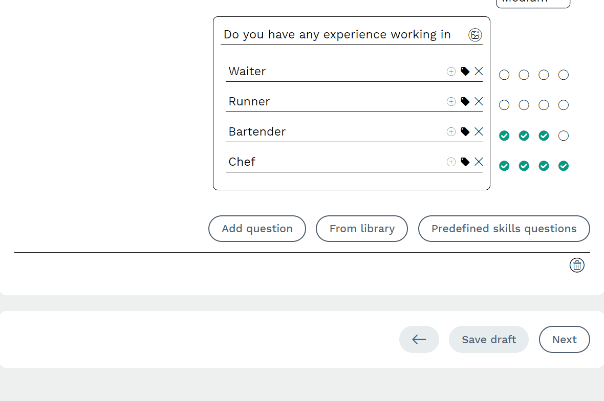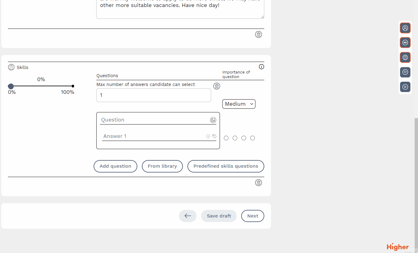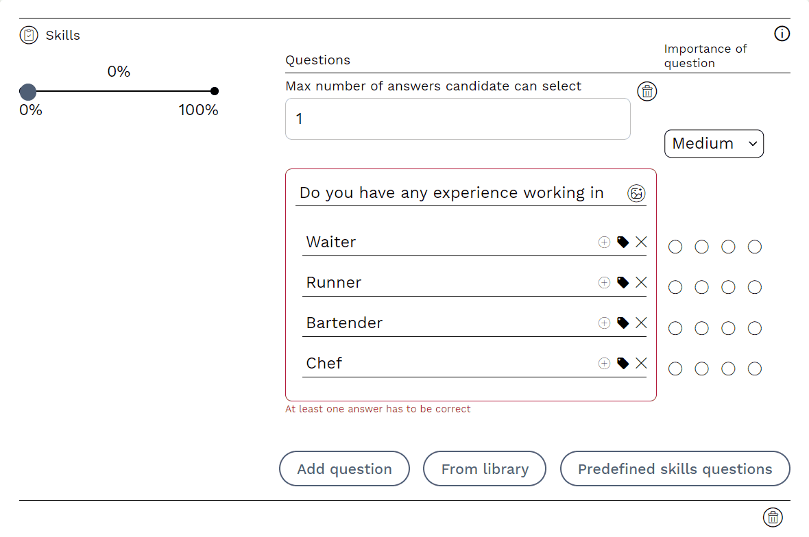 Skills (click here for more info) are questions that correspond to what you are looking for in a resume. Here you can ask situational questions, pure competency-based questions, when the candidate is available to start etc. You can ask up to 30 skill questions in a job advert and 40 in a unsolicited application.
