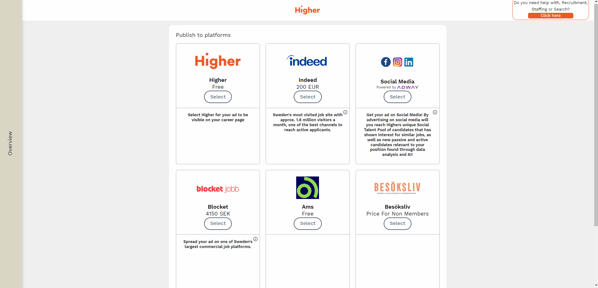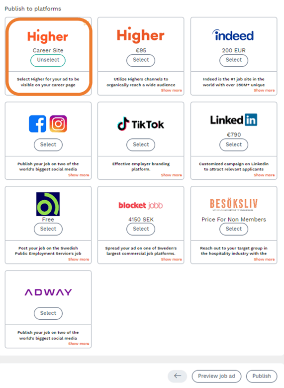 Now it's time to publish your advert on any platform. You should always choose Career Site (it's free) as this option will publish your job ad on the career page. Note that this option has your company logo displayed instead of Higher in this example.