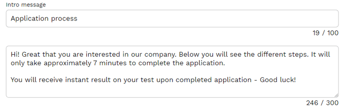 Intro message describes the application process where Higher lists the modules (skills, personality test and video questions) you choose to include. Here you can specify additional processes and preferences you have, to describe the application process.