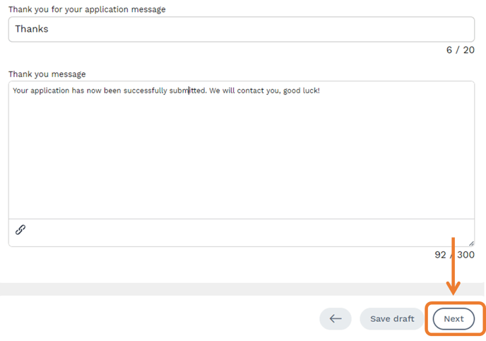 The 'Thank you' message should be seen as a confirmation that the application has been submitted. It is the last thing the candidate sees after finalizing the application. Depending on the processes you have in place for your job adverts, it may look different for each job.