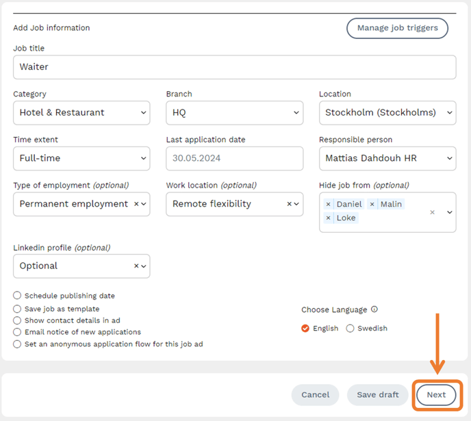 When you have finished including the modules you want in the job advert, go to the last step by pressing "Next".