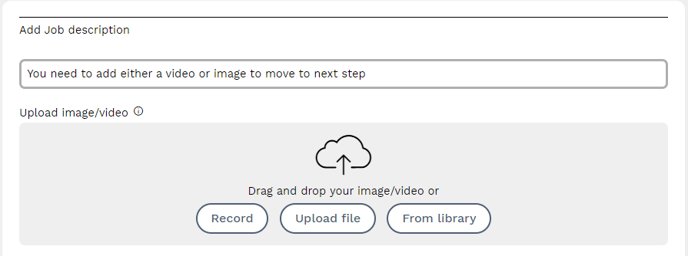 Upload an image or video, this step is mandatory. You can choose to upload a file, record directly in the tool or select from the library. The library is something that is built up over time with your own material you upload.