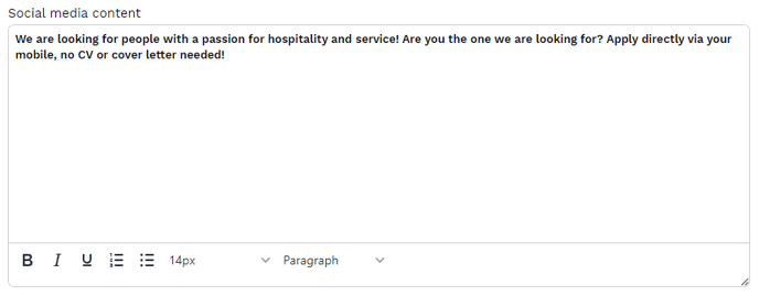 Social media content should be a concise but selling summary of the advert description. This text is the first thing the candidate sees when they scroll through their feed and you want to entice the right candidate to click through to apply. If you choose to buy social media campaigns through Higher, this is the text that will appear in the sponsored posts.