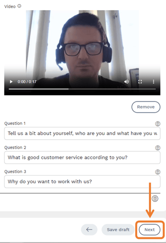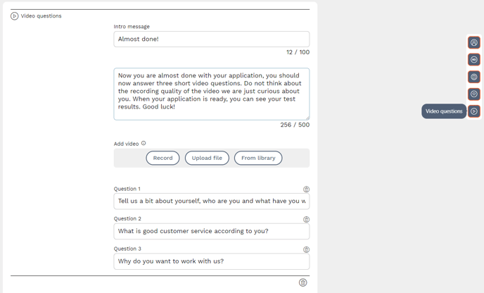 You ask the question in text format and the candidate will answer the question with video. We always encourage you as an employer to also upload a video greeting to the candidate for the sake of the experience. This makes the candidate more inclined to also record their answers