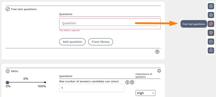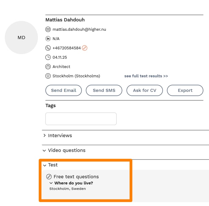 Free text questions are a perfect complement to skills questions, as they allow you to ask open questions where the candidate can elaborate on their answers in their own words. While skills questions help you screen candidates based on scores, free text questions are used to gather information that isn’t suitable for scoring, such as location, previous education or workplaces. These questions do not affect the candidate’s final score but serve as a qualitative complement to the skills questions.