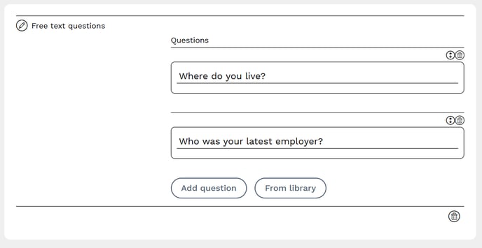 Add a question by clicking “Add question.” All created questions are saved in the library. By selecting “From library,” you can reuse free text questions from previous ads or templates.