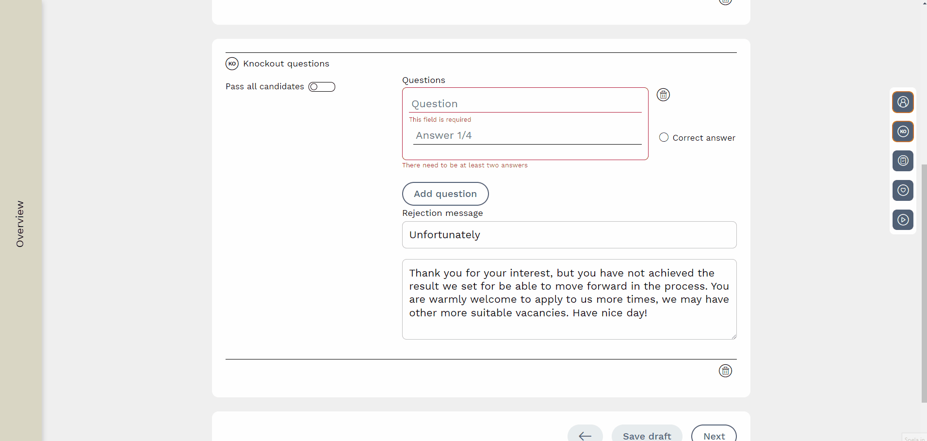 Knockout questions (click here for more info) helps you to screen those candidates who do not fulfill the basic requirements to work for you. In this example, the job requires by law that you are over 18 years old to work. You can have up to 3 knock out questions. You can see how many candidates didn't pass the knock out questions under KPIs & Statistics (click here for more info). Knock-out questions help both you and the candidate save time, the candidate does not apply for a job that they cannot get and you do not have to handle the application unnecessarily.