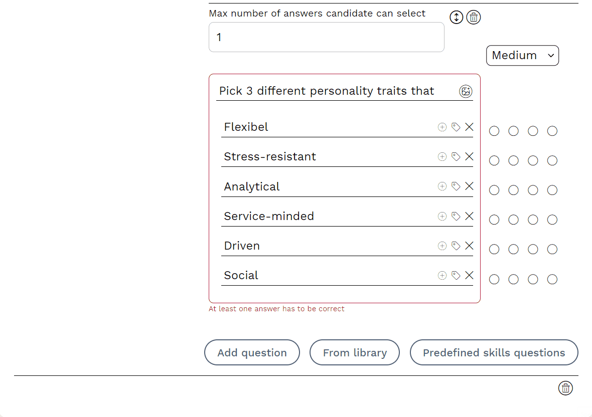 ⚠️ It's important that at least one answer is Most desirable (4 green dots) for the candidate to get 100% correct on a question.