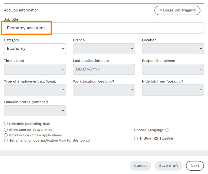 - The AI will use the language you type in. For example - if your company is based in Germany but the job ad is written in Swedish then Swedish will be used for generated content and vice versa.