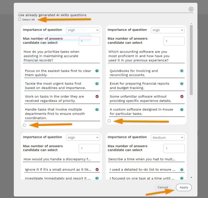 When the generation is finished, you can see and choose which questions to include. You can select all of them or one-by-one. Press "Apply" when you want to proceed.