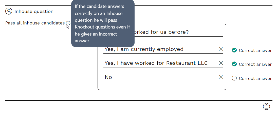 You can allow the candidate to proceed with an application even if they answer incorrectly to any knock-out questions. This will give you the opportunity to decide whether you want to move forward with the candidate or not, or write a more personalized rejection email.