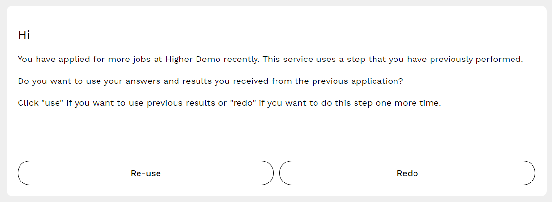 If the candidate has applied for multiple positions at your company, they have the opportunity to reuse the answers and results from their previous application or redo it.
