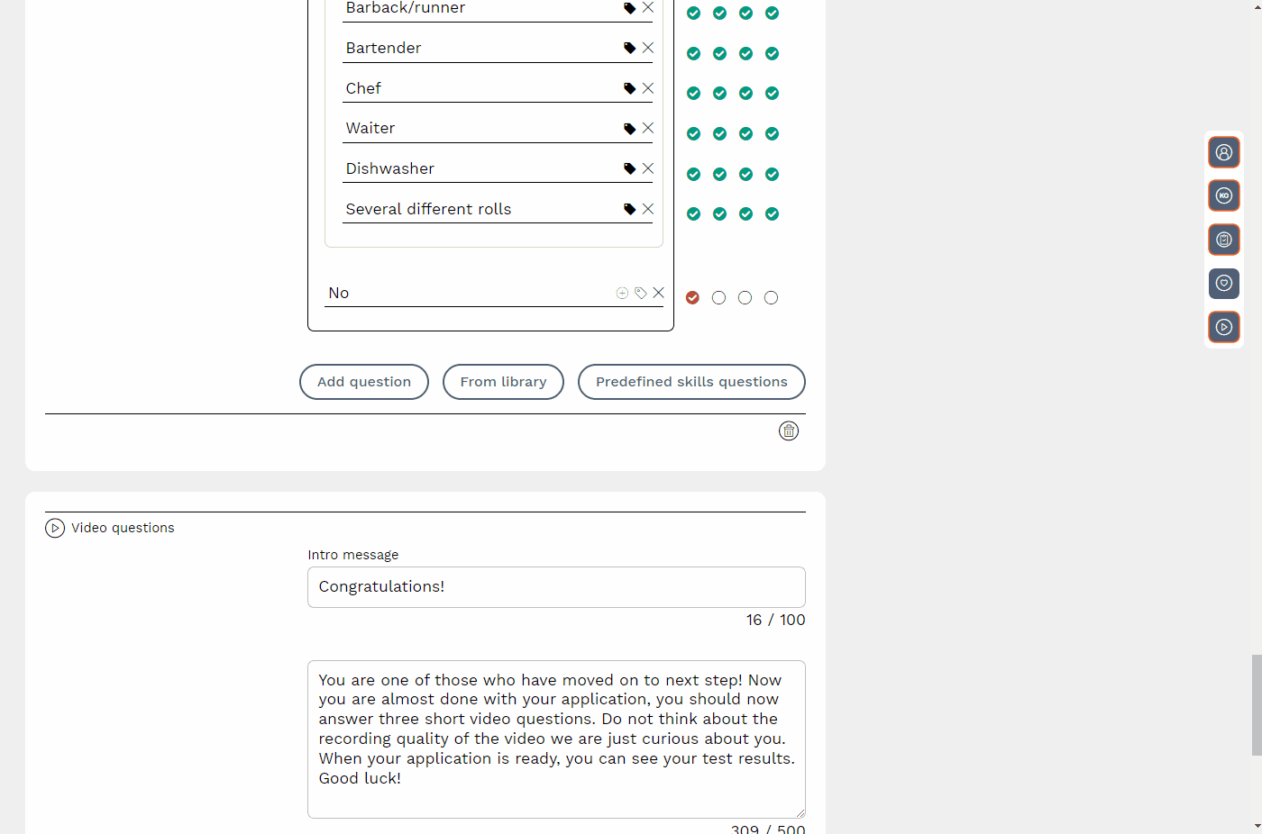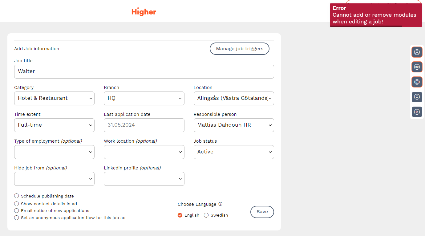 When you activate the module, you have to choose the language in which the test will be shown. By dragging and dropping the icon, you determine the location of the module. Tap the trash can or the symbol to your right if you want to remove the module from your job ad.