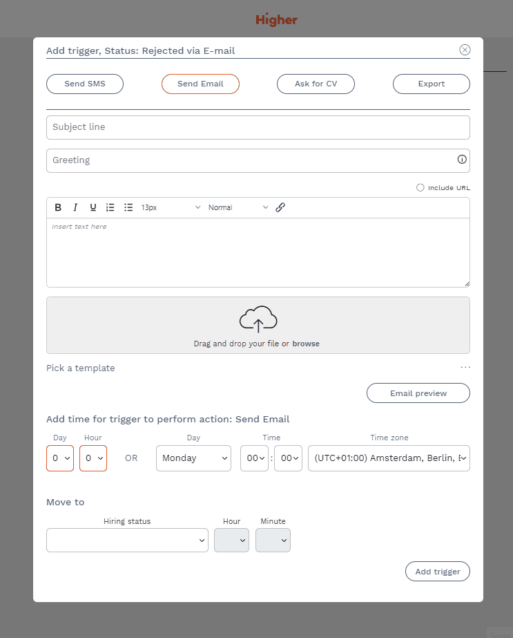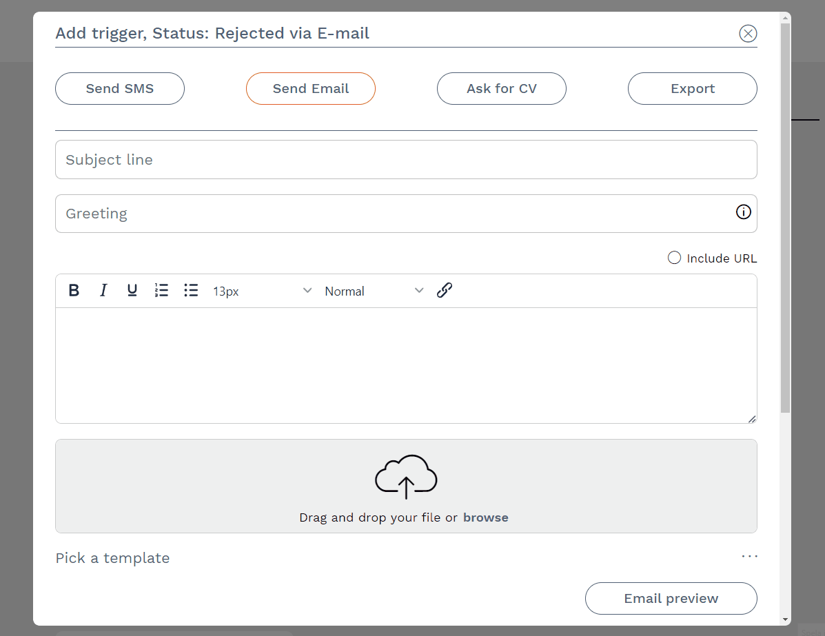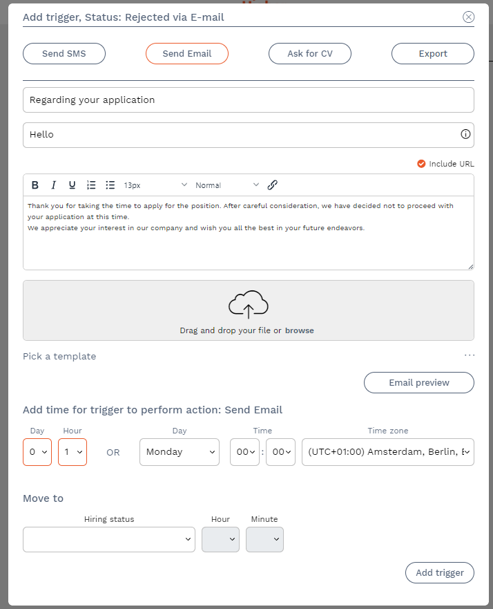 Email triggers allow you to streamline and mass communicate with your candidates. For example, you can use a trigger to send an email to the candidates you do not want to proceed with in the recruitment process.