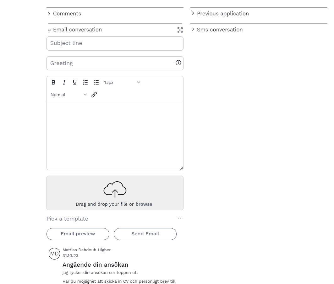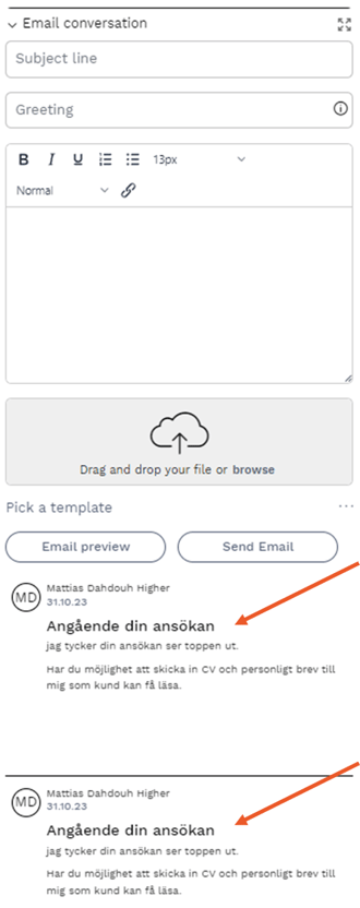 On the candidate card, the two most recent messages with a candidate are displayed. To see older messages, click on the expand symbol. After expanding, you can scroll down or use keyword search to find specific messages.