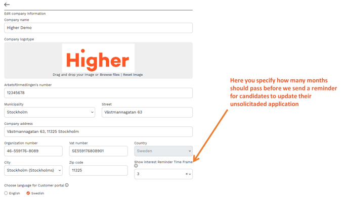 Under company information, you can set up a reminder time for candidates who have chosen to make a spontaneous application via the “Express Interest” button. This reminder means that candidates will receive an email after x number of months with the following options: