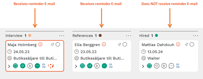 Please note that all candidates receive reminder emails except candidates placed in the “Hired” column of the Recruitment Board.