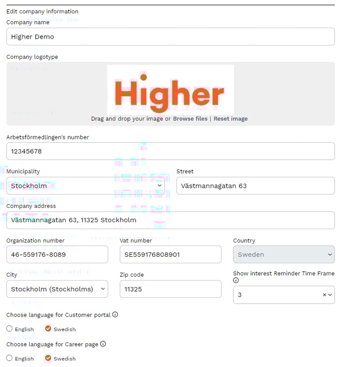 Here you can change information such as the details of your company, your logo, name, the language you want on the career page and the customer portal.