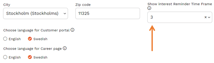 This is also where you set the "Show interest - reminder time frame". The selected value is referred to months. It determines how often Higher will send an email to the candidates who have sent their unsolicited application to you. This only applies to users who have chosen to activate "Express interest" on their career page.