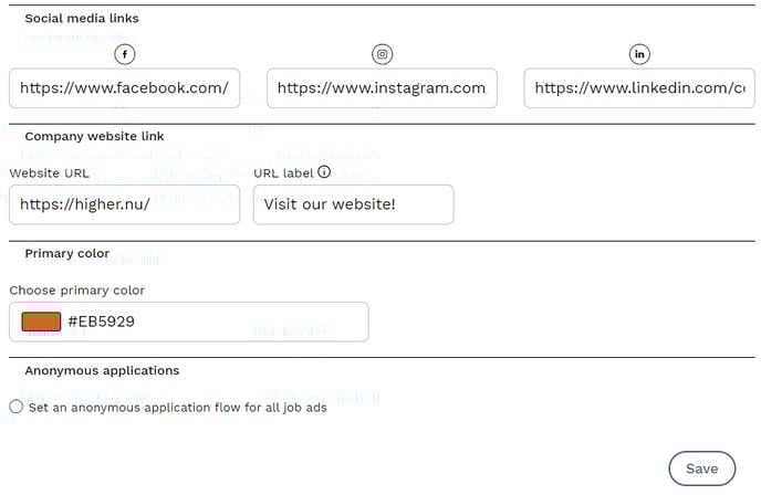 You can also enter the links you have to your social media on this page and change the URL label (i.e. what should be displayed instead of "Company website" which is the default today on the career page). Primary color sets the color theme of the career page and you can also decide whether all new ads published have an anonymous application flow or not.