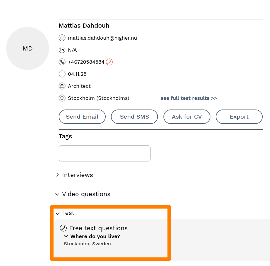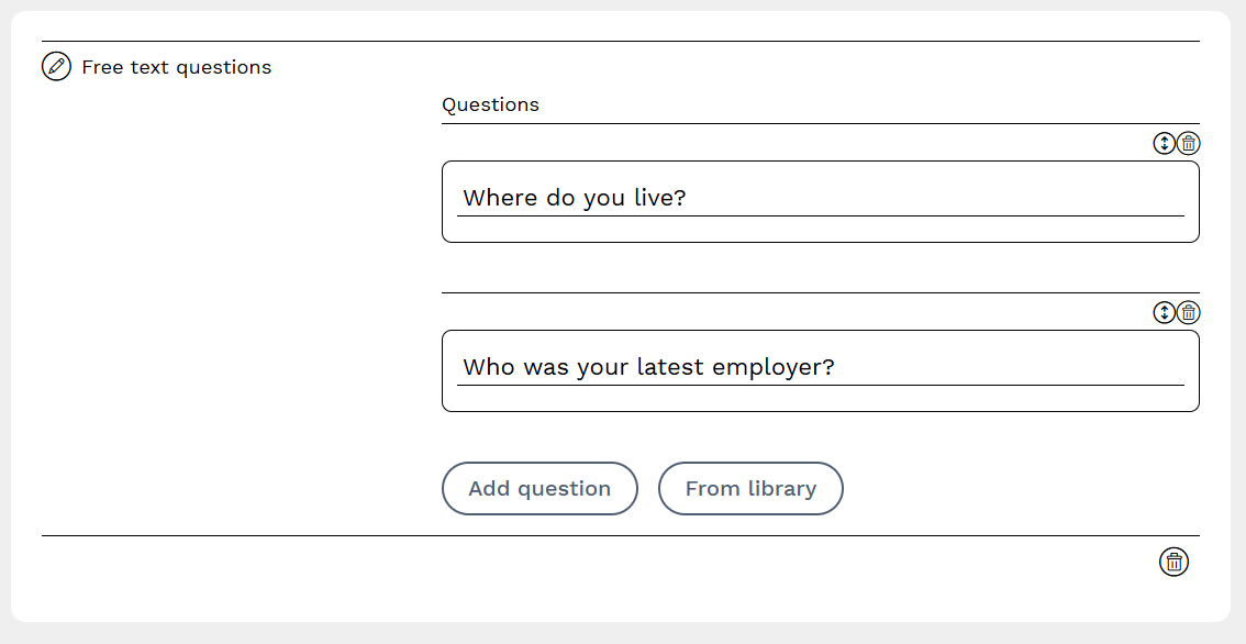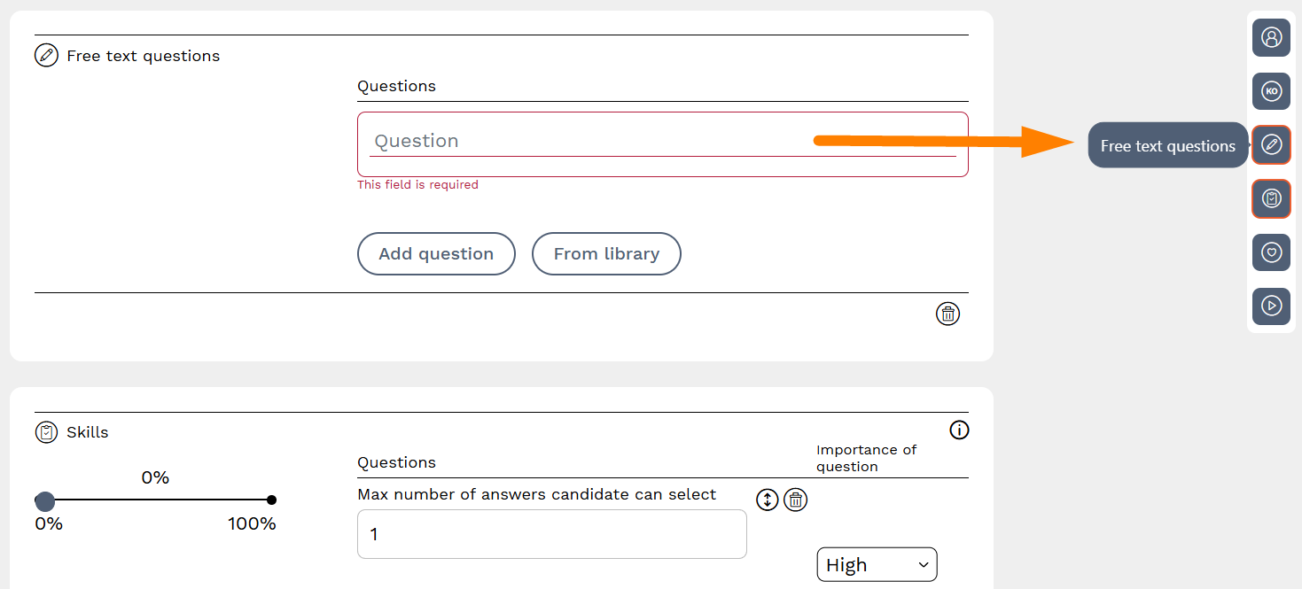 Free text questions are a perfect complement to skills questions, as they allow you to ask open questions where the candidate can elaborate on their answers in their own words. While skills questions help you screen candidates based on scores, free text questions are used to gather information that isn’t suitable for scoring, such as location, previous education or workplaces. These questions do not affect the candidate’s final score but serve as a qualitative complement to the skills questions.
