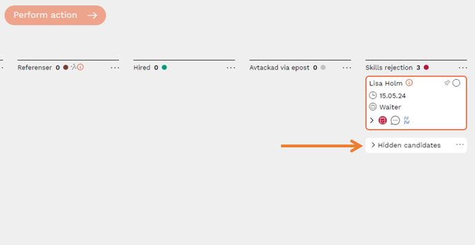 3. When you press "Hide", the candidates you previously marked will be hidden behind a group called "Hidden candidates". It always appears at the bottom of the candidate cards. Each column can have a group of hidden candidates.