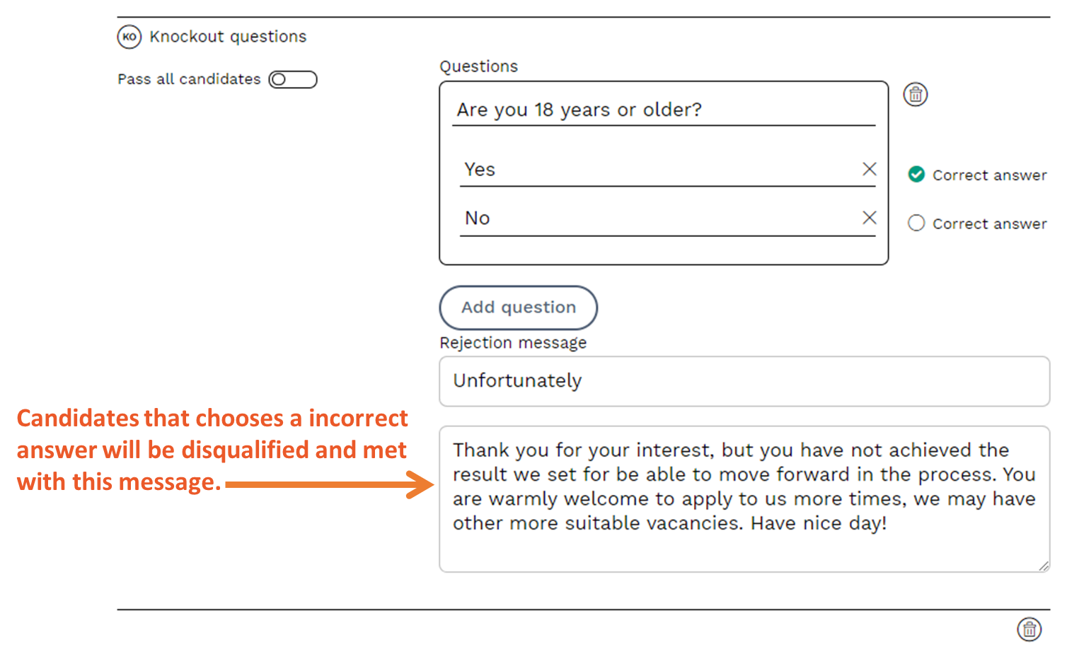 If a candidate answers the question correctly, they move on in the application process. However, if they provide a incorrect answer, the candidate will be automatically disqualified. So it is important that you ask good and correct questions that candidates can easily understand.