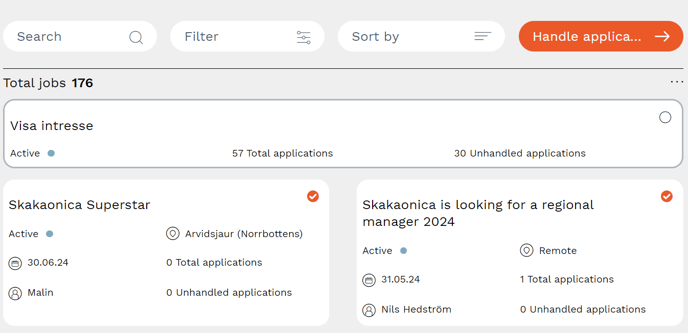 Here you manage all the jobs and candidates you have access to according to your authorization. You can select one or more jobs for which you want to manage searches in the board. In the board, you can sort, search and filter the jobs you want to see. After selecting the jobs you want to see, press the “Manage applicants” button to proceed.