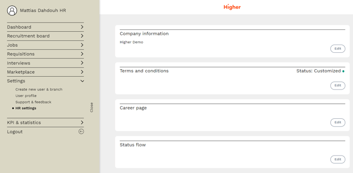 - Here you can view and modify the terms of use for candidates applying to you via Higher ATS.