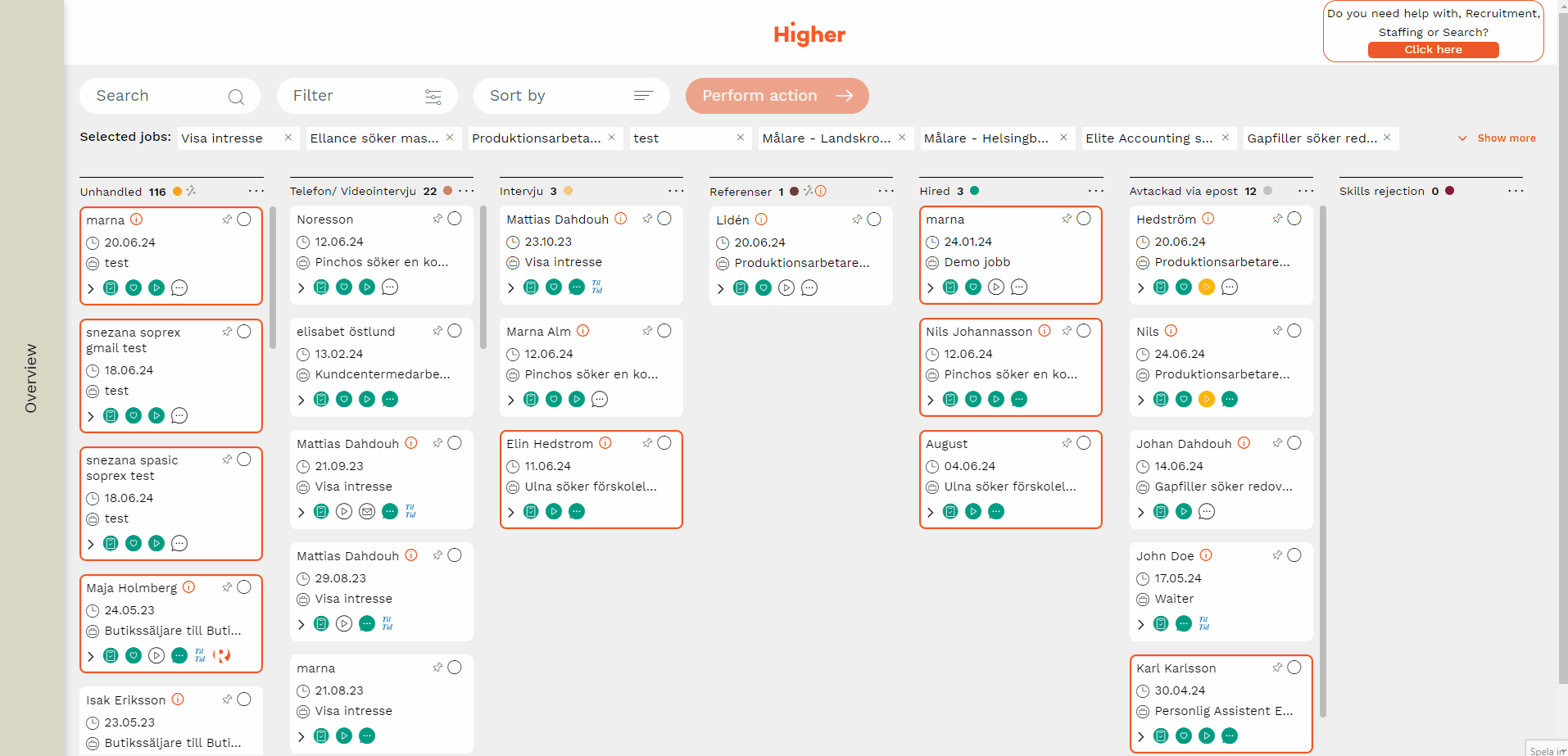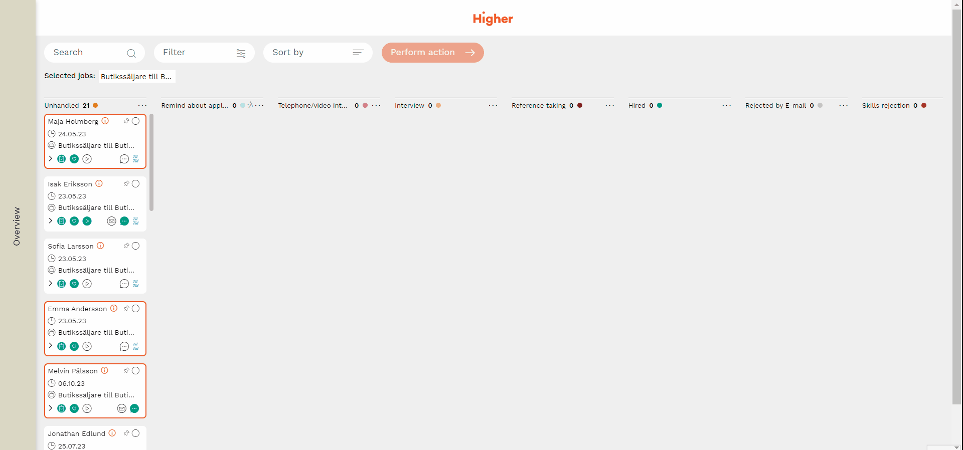 On the recruitment board, you have the opportunity to filter candidates based on a variety of conditions. With just a few clicks, you can quickly and easily, for example, remind candidates to complete their application, see who has given complete video answers and who hasn't, etc.