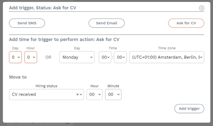 💡 You can choose to move a candidate automatically to a new hiring status when a counter-performance is fulfilled by the candidate. In above example, when the candidate replies with their CV, they will be automatically moved to hiring status "CV received" without delay.