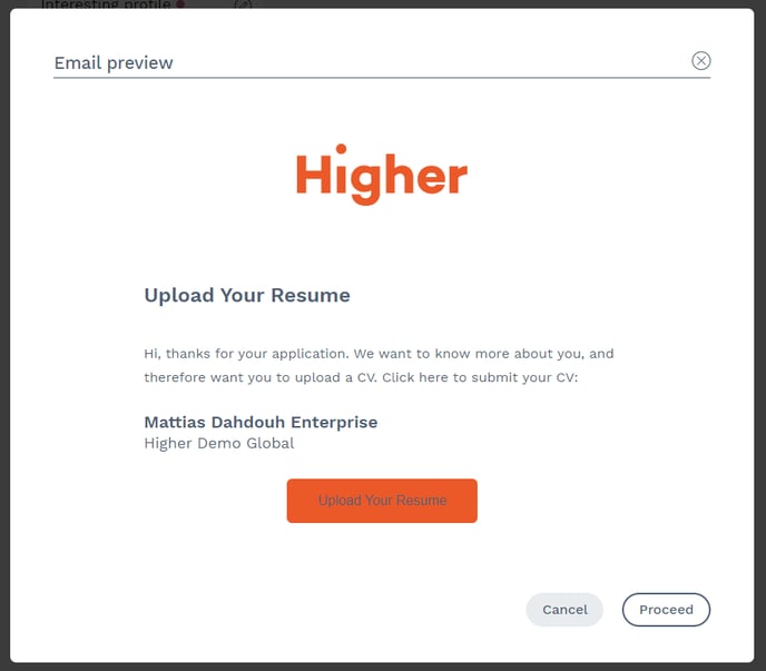 The CV request will be sent as an email by clicking on "Ask for CV". The candidate will then be able to upload a resume using any of the following formats.
