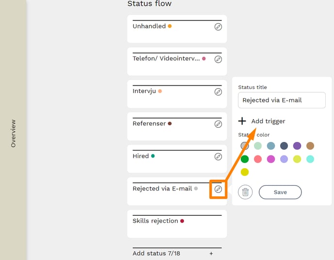 The next step will present you with a list of all the status columns you have in your Recruitment Board. Press the edit button for the column you want to create the trigger for and select "Add trigger".