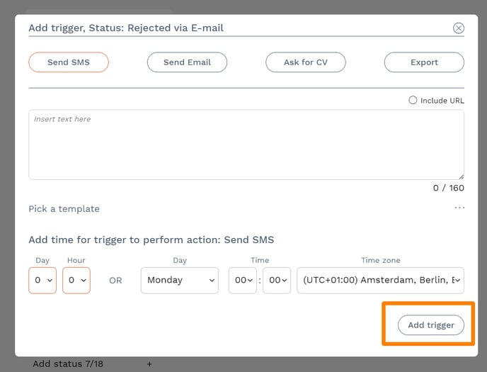 Now you can choose the type of trigger you want; send SMS, send Email, Ask for CV or Export to TIL-Tid/RefApp. Once you have selected your trigger, press "Add trigger" at the bottom right of the page.