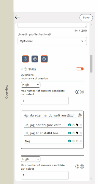 It is a good idea to tag some of your answer options so that you can search for them in the recruitment board. Examples of tags could be the type of employment the candidate is after, the type of position, department, role, etc.