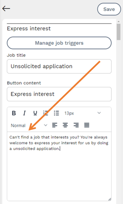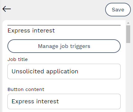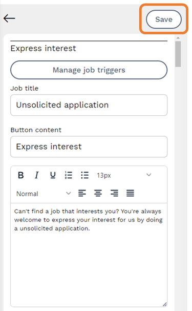 Here you can decide the button content, the job title and whether it should be a unique trigger for unsolicited applications.
