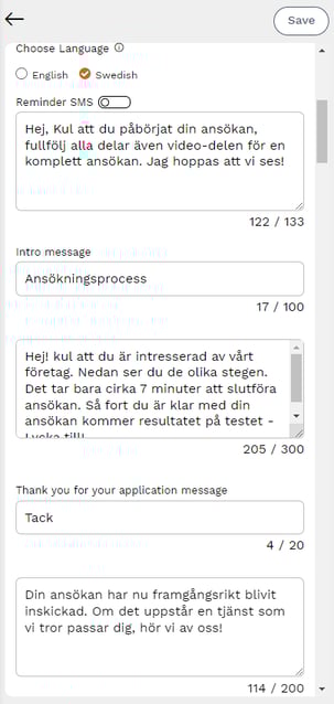 Unsolicited applications contain the same text fields as job adverts/templates. Here you can choose the text language, activate SMS reminders, describe the application process and determine the confirmation message to the candidate upon receipt of the application.