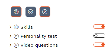 The modules you can include in the unsolicited application are Skills (you can have up to 40 skill questions), Personality Test and Video Questions. In the image below, Skills and Video Questions are active and Personality Test is inactive.