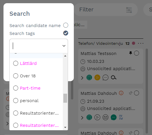 💡 It is also possible to combine tags, e.g. "Part-time" and "Extra if needed". When you combine tags, the candidates who answered both "Part-time" and "Extra if needed" will be visible, the rest will be filtered out. If you do not find a candidate with your selected tags, there is no candidate that fulfills those specific criteria.