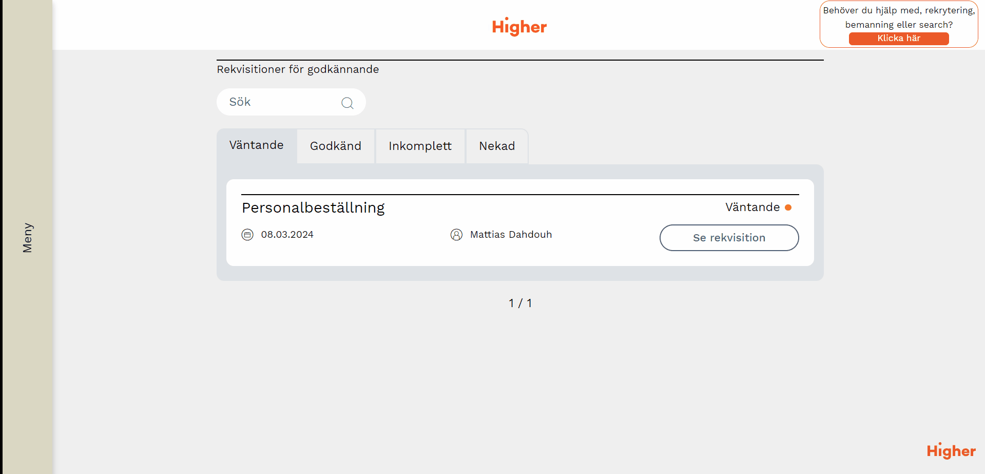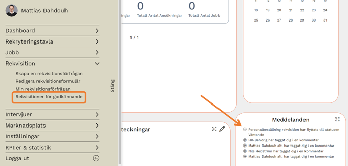 För att hantera rekvisitioner går du till Meny > Rekvisition > Rekvisitioner för godkännande (du kommer även åt dem via Meddelanden/notiscentret).