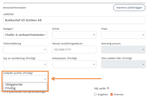 I samband med att du skapar ett jobb eller mall får du möjlighet att erbjuda kandidat att lämna sin Linkedin-profil. Du kan välja att göra det obligatoriskt eller frivilligt för kandidaten.