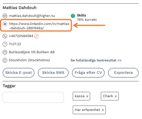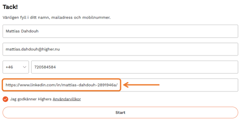 När kandidat registrerar sina kontaktuppgifter i samband med sin ansökan, kan de länka sin Linkedin-profil.