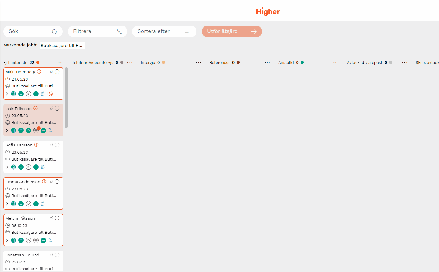 💡 Medan exemplen ovan visar hur du flyttar kandidater från en kolumn till en annan, gäller samma princip för att skicka e-post, SMS eller be om ett CV. Higher är utformat för att göra det enkelt för dig att hantera stora mängder ansökningar samtidigt och ovan är några av de många sätt som gör det möjligt för dig att göra det.