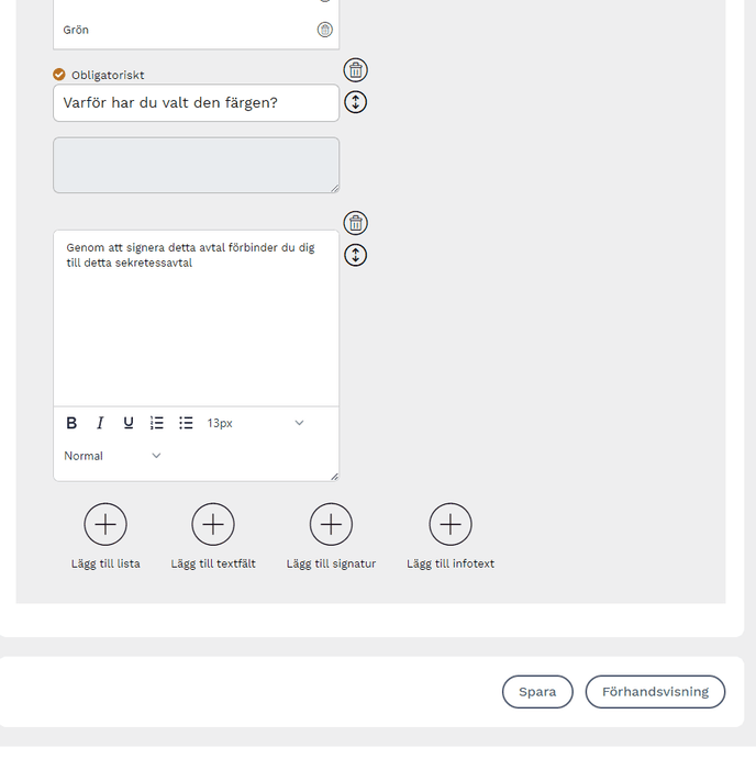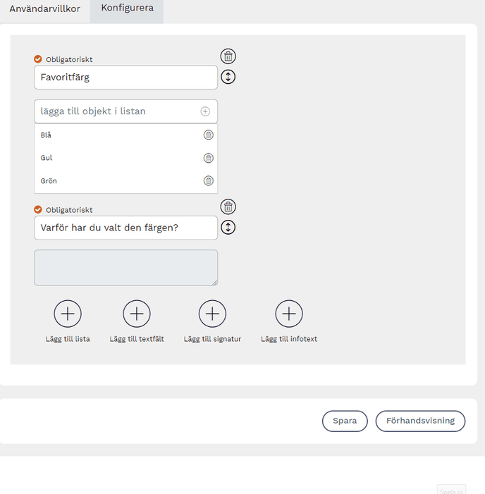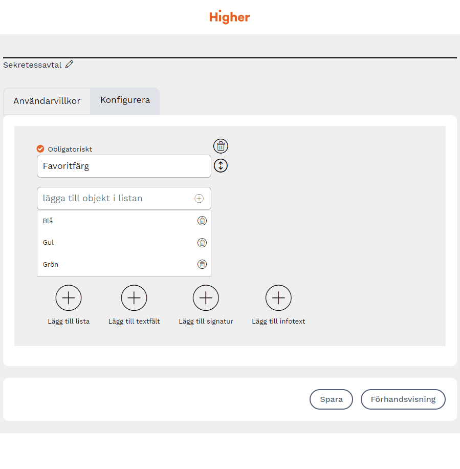 Genom att lägga till en lista får mottagaren möjlighet att välja en eller flera alternativ i listan. Du kan välja om denna del ska vara obligatorisk eller inte. Är den obligatorisk kan mottagaren inte skicka in avtalet förrän ett val har gjorts.